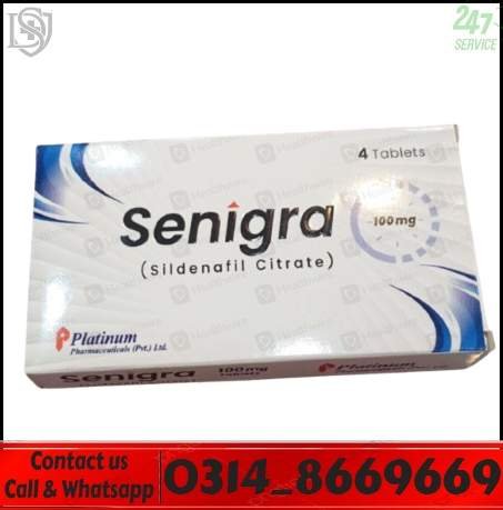 Senigra Tablets 100mg in Pakistan are commonly used for the management of erectile dysfunction in adult men. Formulated with Sildenafil Citrate 100mg, Senigra helps support improved blood flow, confidence, and performance when used responsibly under medical guidance.